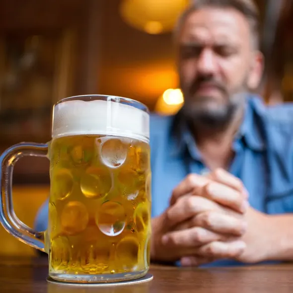 Мужчина беседует с врачом на фоне кружки пива